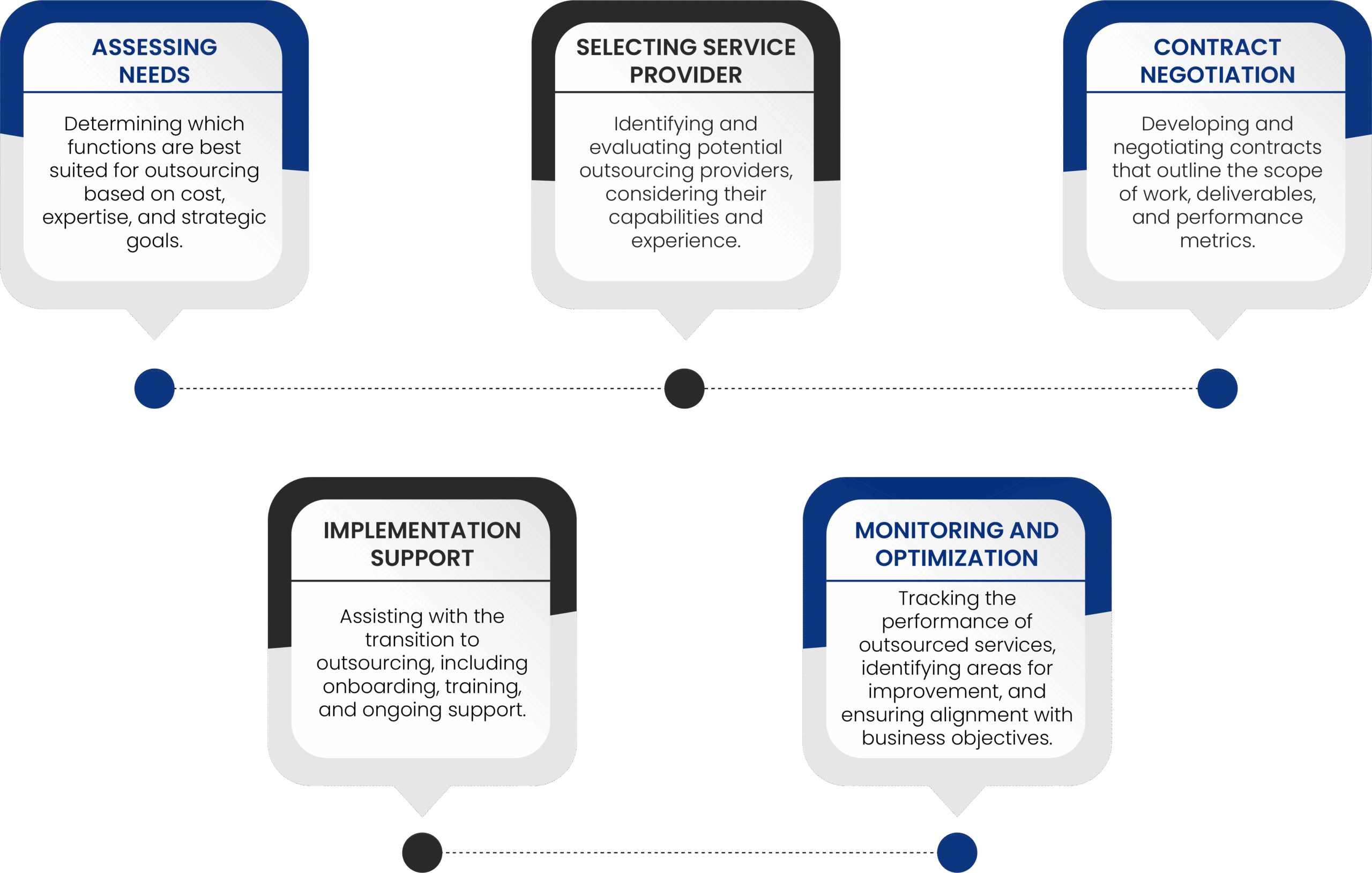Our outsourcing consultation involves identify which all functions to outsource, selecting the right service provider, negotiating contracts, and overseeing the transitioning and implementation of deliverables.